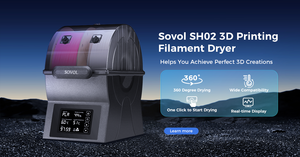 The Sovol Filament Dryer Box can heat and print with two filament spools. It heats up to 40-50°C, removing moisture and improving print quality. The box features a silicone spacer and cover for a tight seal, keeping humidity low. This lets you store filaments for a long time without power. The touch screen is easy to use and shows temperature, humidity, and timer clearly.