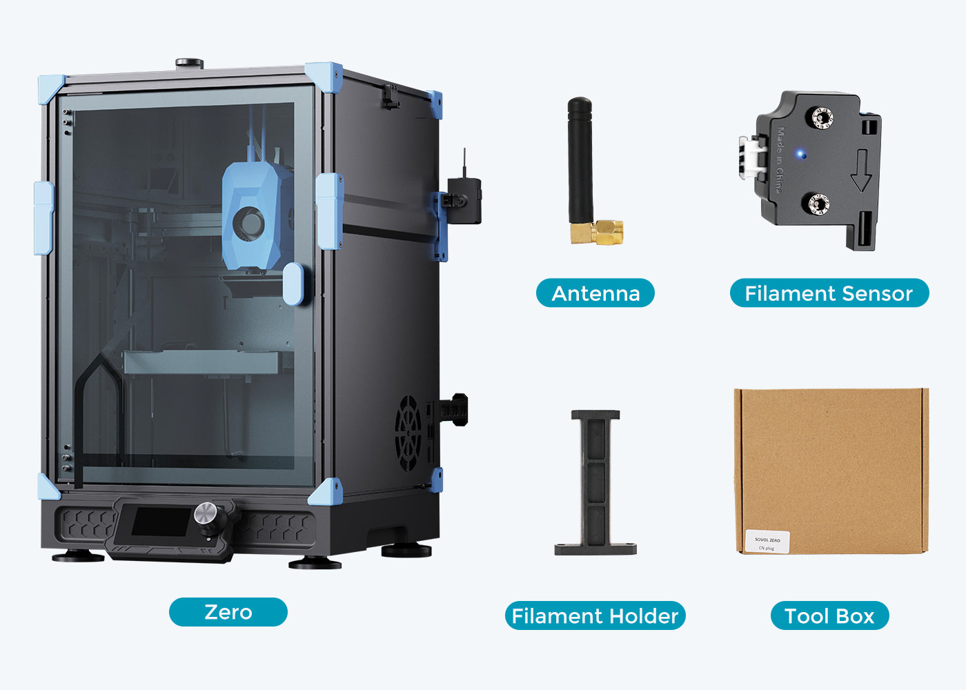 As you can see, it includes the complete printer installed (Filament holder, screen, signal receiver, filament sensor which takes a minute to assemble), 0.4mm*2 nozzles, and a roll of filament for testing the printer.