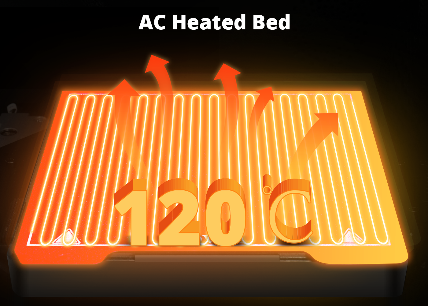 Zero utilizes an AC heated bed, reaching a maximum temperature of 120°C. AC heating enables faster heat-up, reducing preparation time and ensuring stable bed temperatures during long prints. A high-temperature heated bed is essential for successfully printing high-temperature filaments. It also includes an overheating protection feature for added safety.